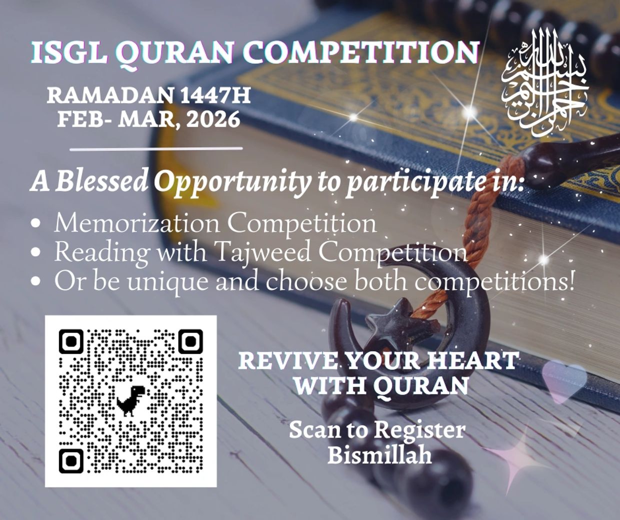 The Quran Competition will be held in Ramadan 1447H/Feb- Mar 2026, at ISGL Masjid, In Shaa Allah.